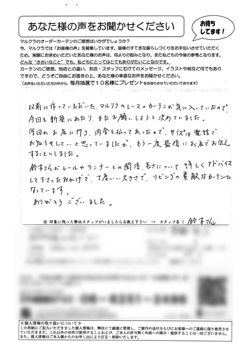 兵庫県川西市 M.Y様 [投稿日]2016年6月24日 口コミ お客様の声 2016.06.24 昨日、カーテンが届きました。予定より早く仕上り、新年度(4月~)のスタートをワクワクして迎えました。有難うございました。早速、新しいカーテンをつけて見て、仕上りにとても満足しています。広告を見て、割引率にスゴイ!と思うと同時に本当?と思いながらお店に伺いました。でも、商品の品揃えと価格にビックリでした。担当して下さった方のアドバイスもあり、主人の「即、これで!」の一声で買い物終了。わずか、20分位だったと思います。今回は2窓の買い替えでしたが、次回も利用させていただきたいと思いました。