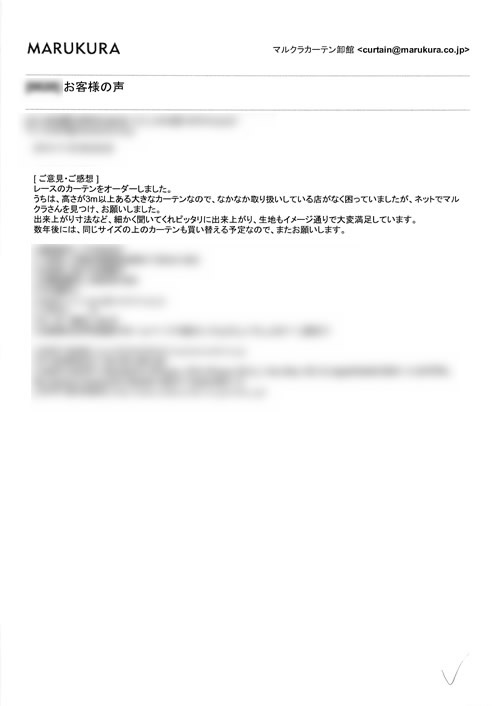 初めてのオーダーカーテンを買うということでお店へ行きました。担当して下さった川中さんは、てきぱきと対応して下さいました。又、カーテンの計り方、レールの違い、フックの事など何も知らない私達にきちんと説明して下さいました。長さもピッタリで気持ちよく使っています。すごくまんぞくしています。ありがとうございました。
