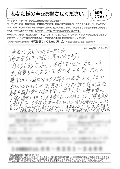 京都府京田辺市 Y.M様 対応もとても親切で満足です、届いたカーテンも… [投稿日]2018年4月27日 口コミ お客様の声 2018.04.272018.05.01 対応もとても親切で満足です、届いたカーテンもとてもていねいに詰められており、ワクワク感でいっぱいになりました。サイズもぴったりで次回注文することがあれば又貴社に!!と思いました。有難うございました。