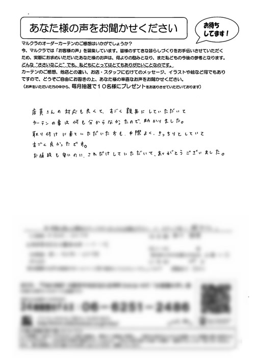 香川県仲多度郡 B.H様 娘の一人暮らしにあたりカーテンをさがして… [投稿日]2018年11月8日 口コミ お客様の声 2018.11.082018.11.14 娘の一人暮らしにあたりカーテンをさがしていました。カーテンの種類の多さにびっくりしました。おかげ様で娘の部屋にあったカーテンをみつけることができて喜んでいます。スタッフの方にもていねいに対応していただき、ありがとうございました。