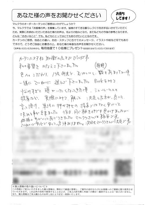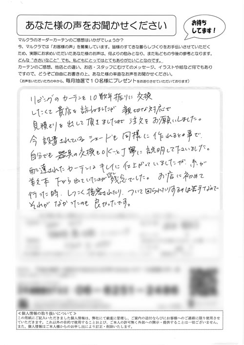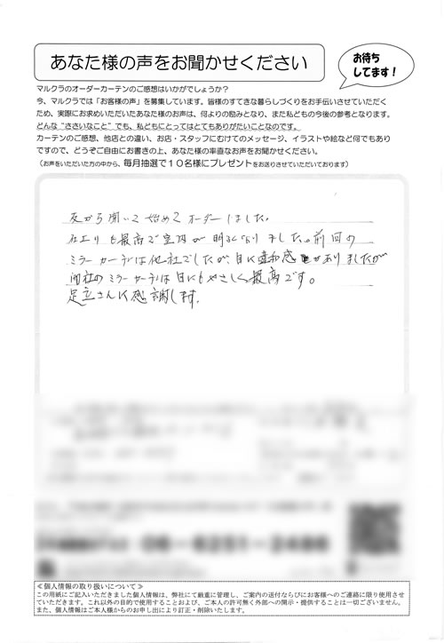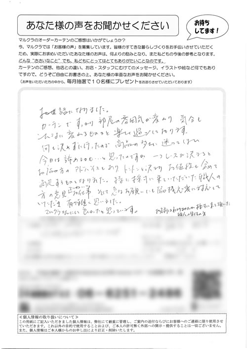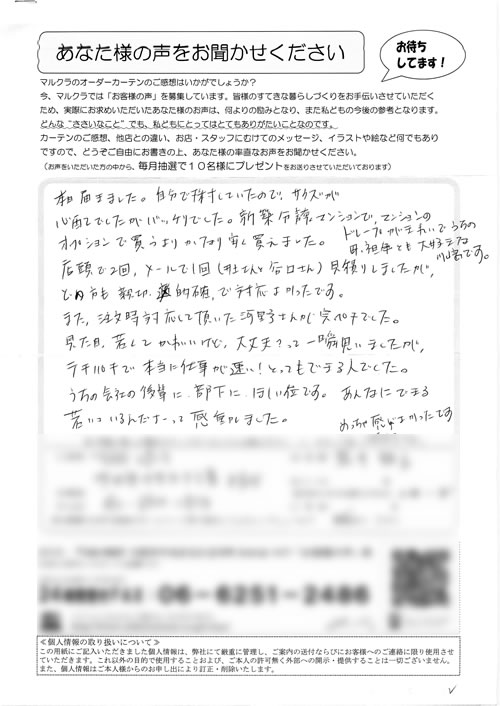 口コミ お客様の声 大阪府吹田市 S.M様 お世話になりました。カーテンですっかり部屋の…