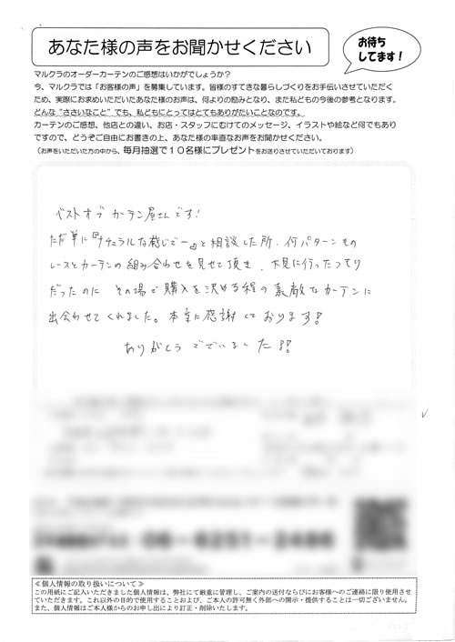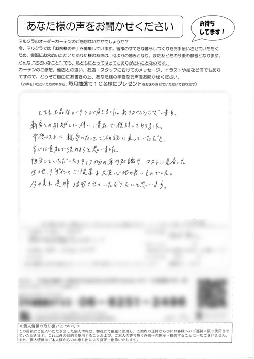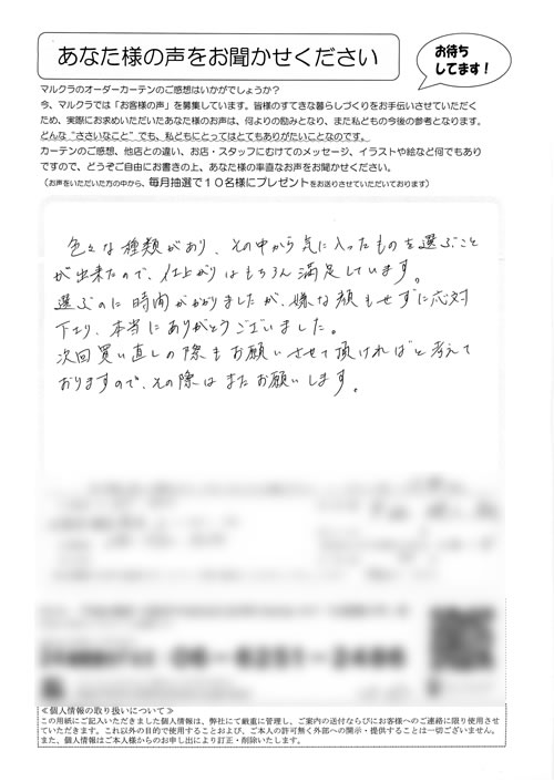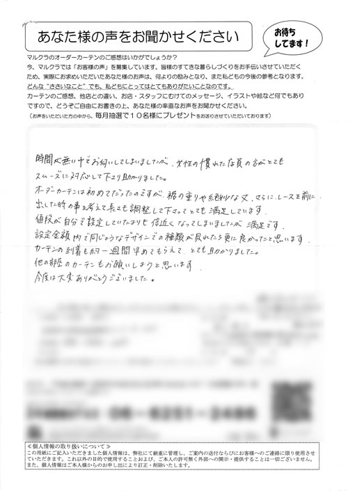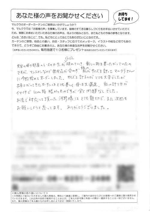 口コミ お客様の声 京都府京田辺市 Y.M様 対応もとても親切で満足です、届いたカーテンも…