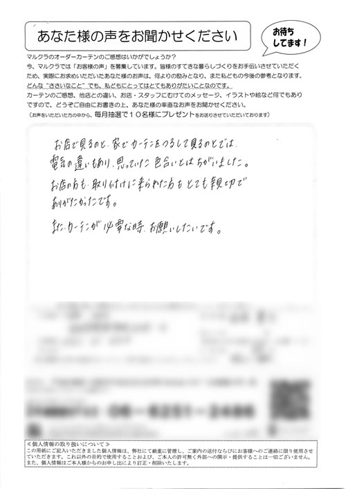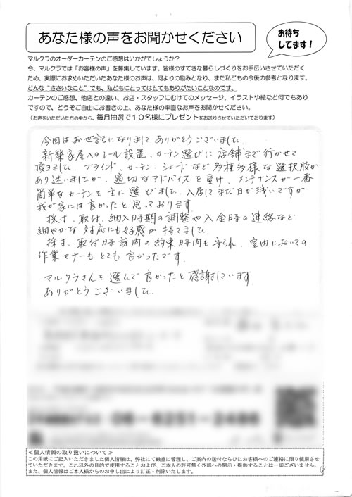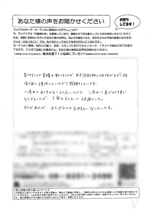 別のところで見積を取りましたが、まず圧倒的に価格がちがいます。安価に提供していただき感謝しています。一度めに女性の方に対応いただき、二度めは妻が代理で行きましたが、丁寧な対応で快適でした。何かあれば、またぜひともお世話になりたいです。