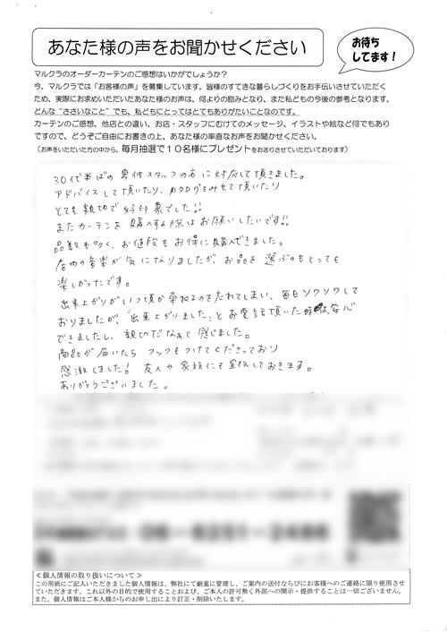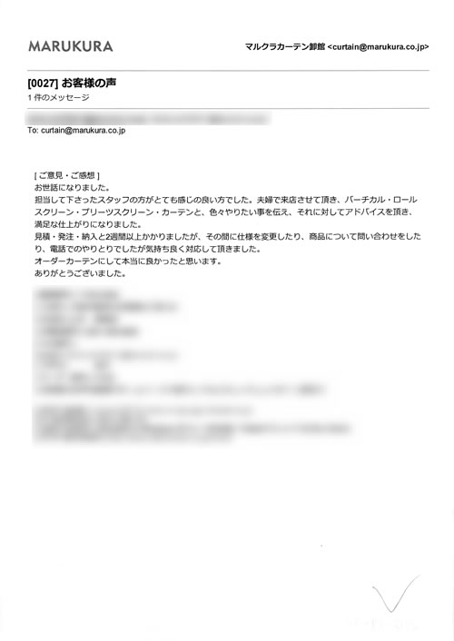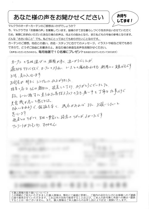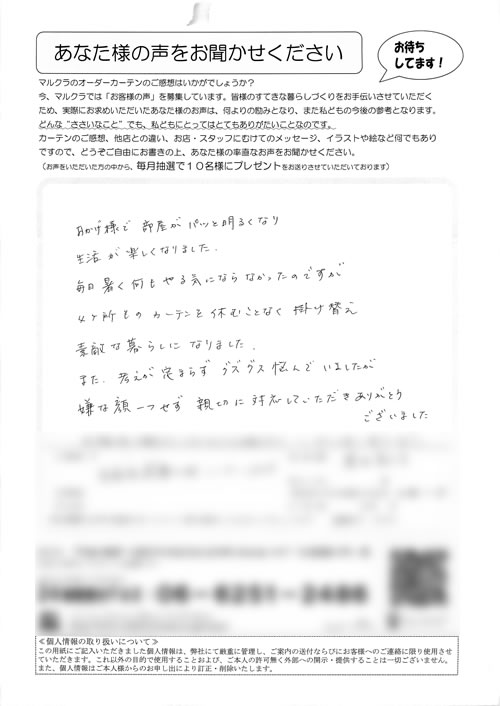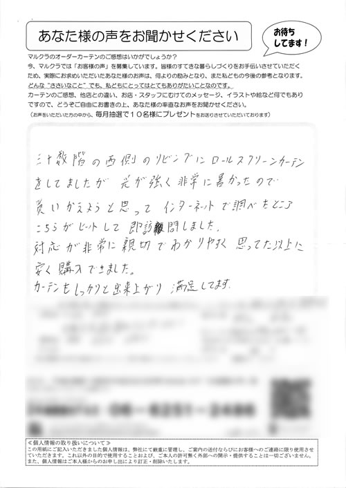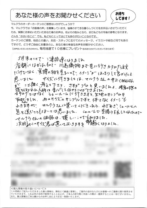 口コミ お客様の声 大阪市天王寺区 Y.A様 初めてオーダーカーテンを注文したのですが…