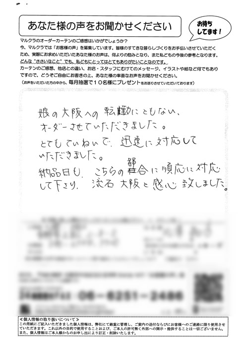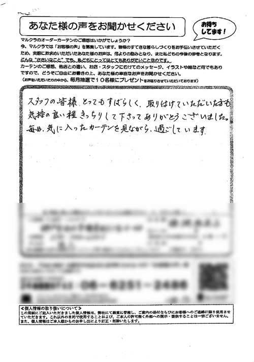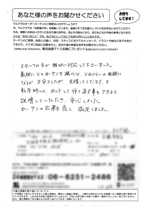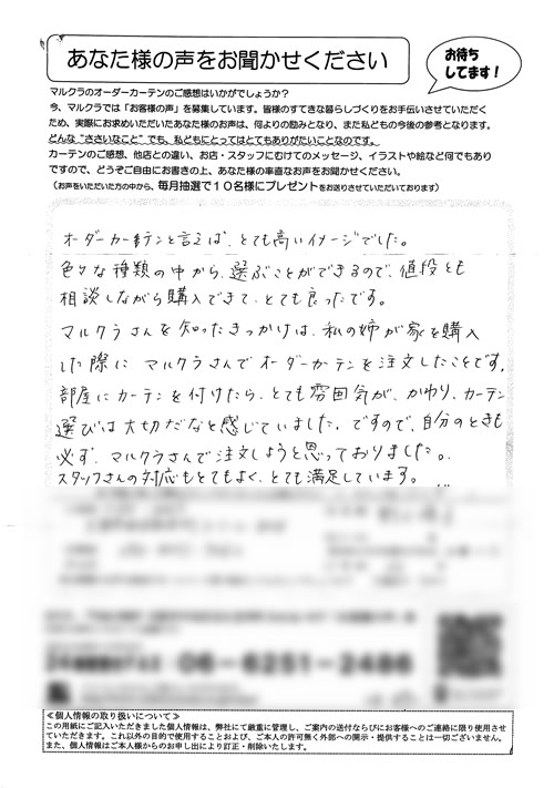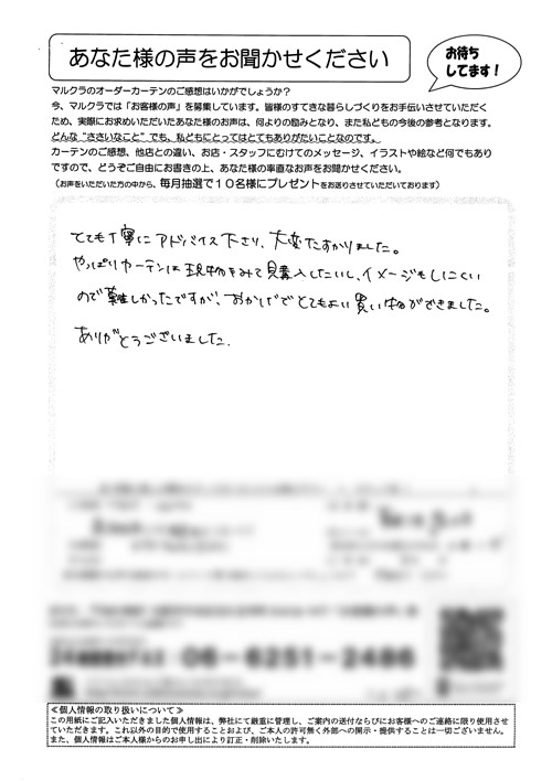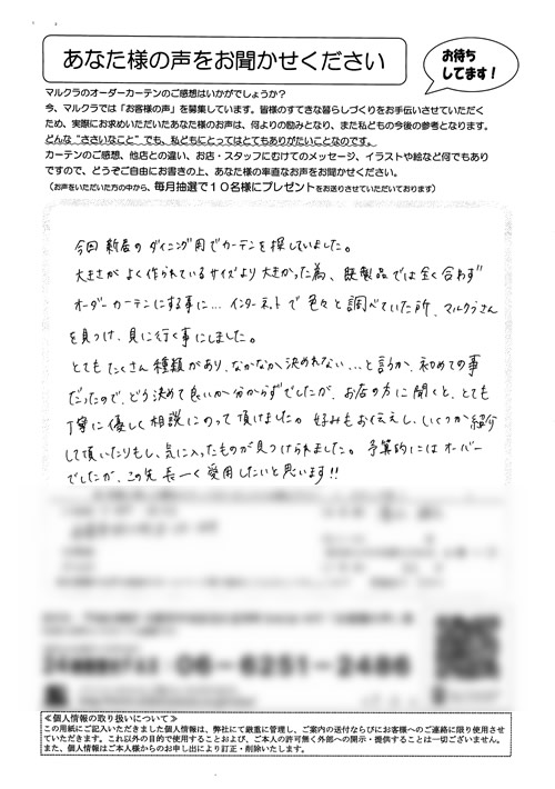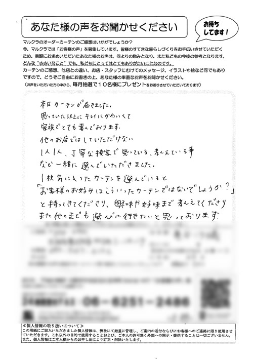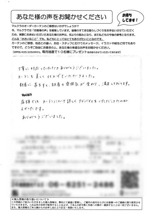 口コミ お客様の声 大阪府東大阪市 K.S様 とても可愛いカーテンを一緒に選んで頂きとても…