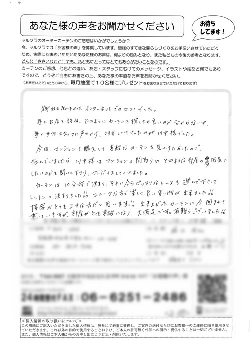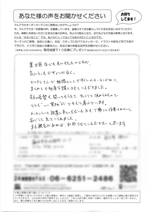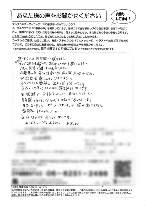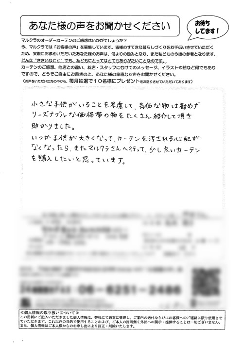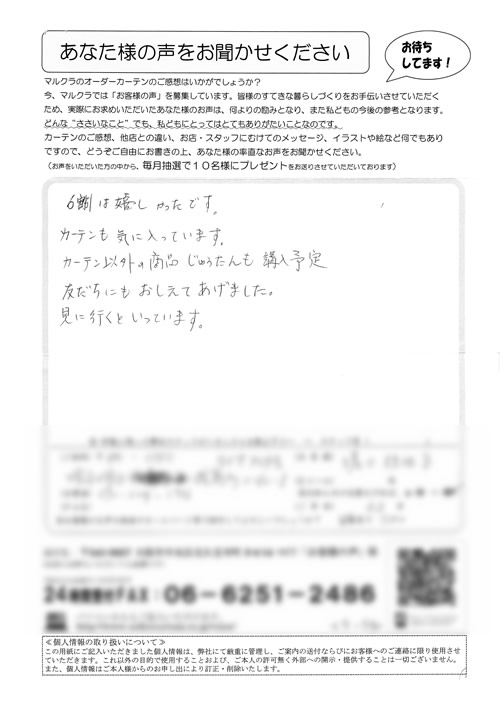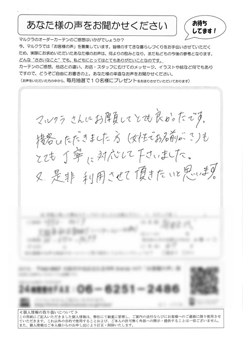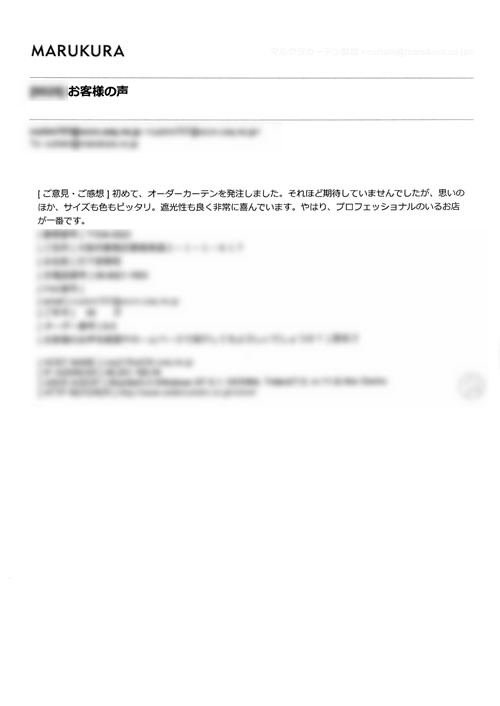 口コミ お客様の声 大阪府堺市 N.K様 いいカーテンを購入出来まして満足しています。自分の…
