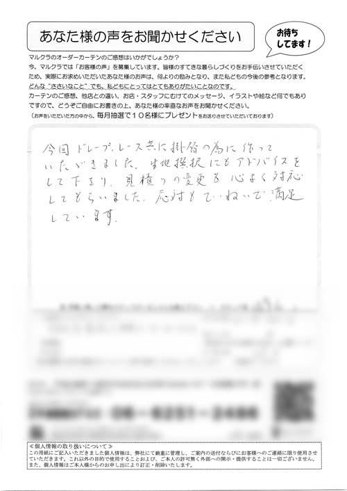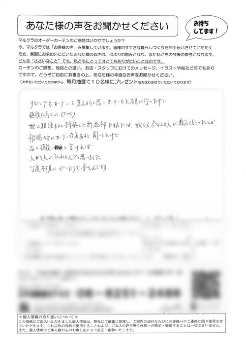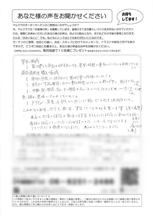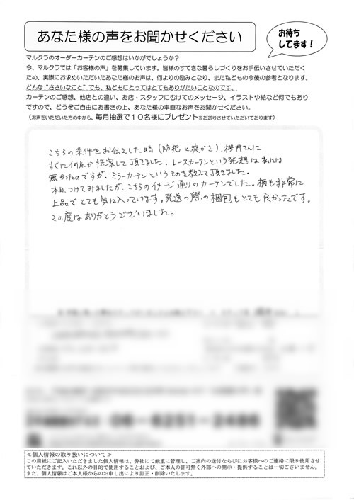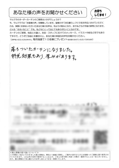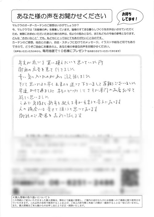 年末が近づき買い替えたと思っていた所、御社の広告を見て行きました。幸い気に入ったのがあり注文しました。そして思っていたより早く出来上がり送って下さいまして有難うございました。早速かけてかけてみました。本当にピッタリしてさすが専門のお店だなと...