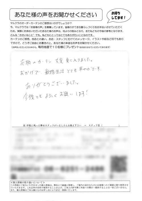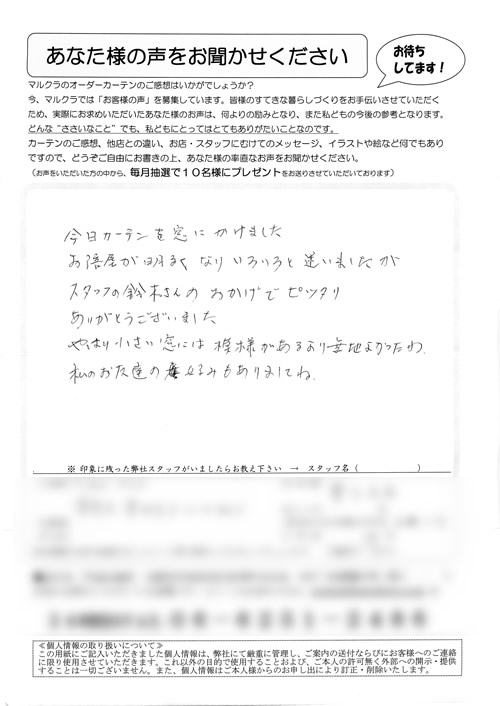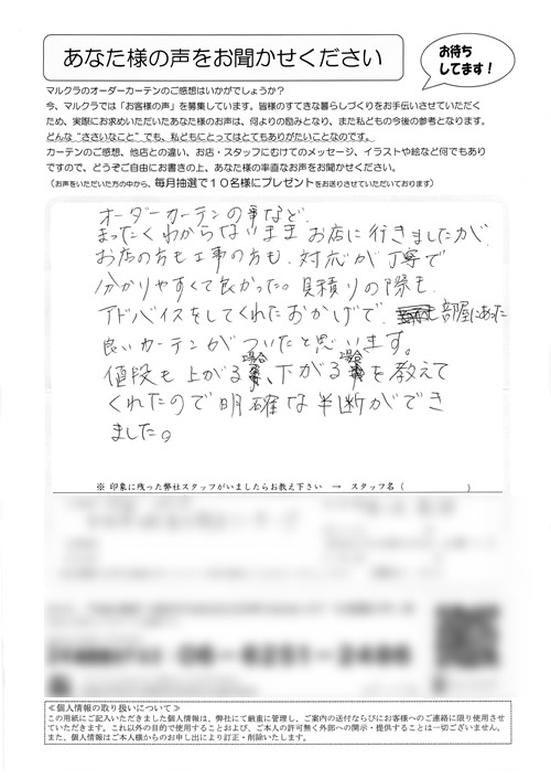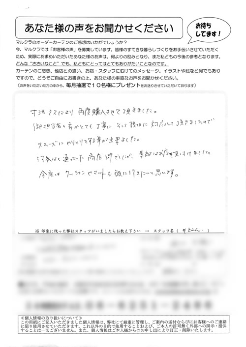 初めてのオーダーカーテンを買うということでお店へ行きました。担当して下さった川中さんは、てきぱきと対応して下さいました。又、カーテンの計り方、レールの違い、フックの事など何も知らない私達にきちんと説明して下さいました。長さもピッタリで気持ち...