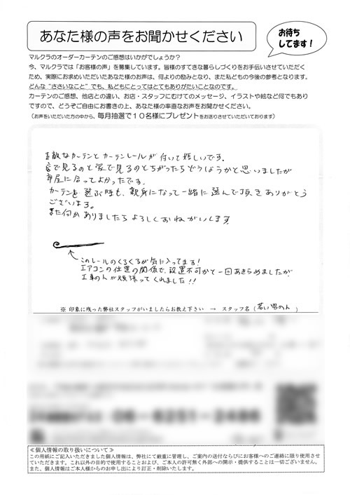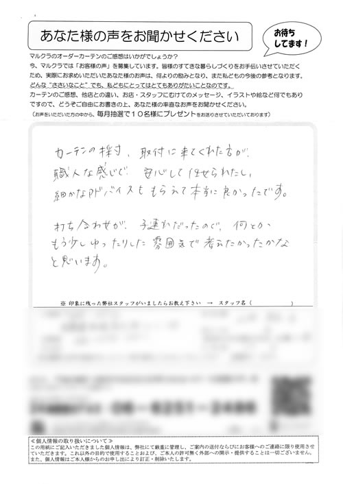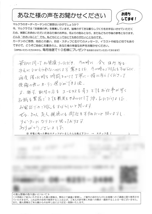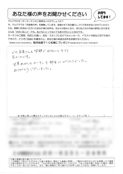 どの店員さんも笑顔で対応して下さり良かったです。出来あがったカーテンも部屋にぴったりでした。ありがとうございました。