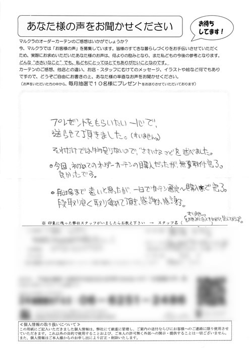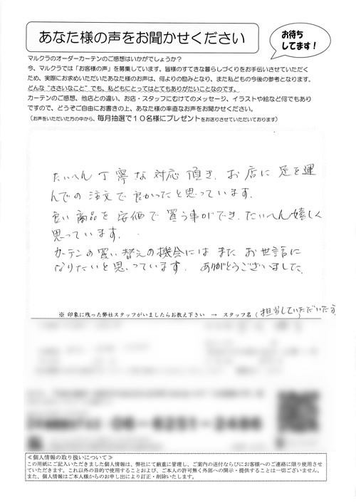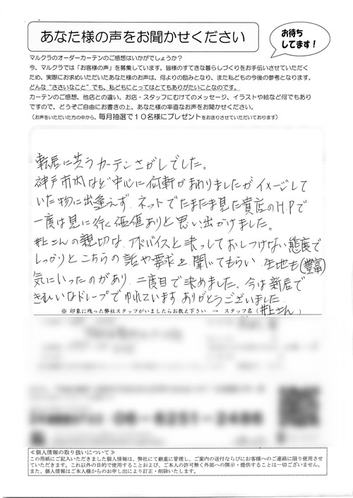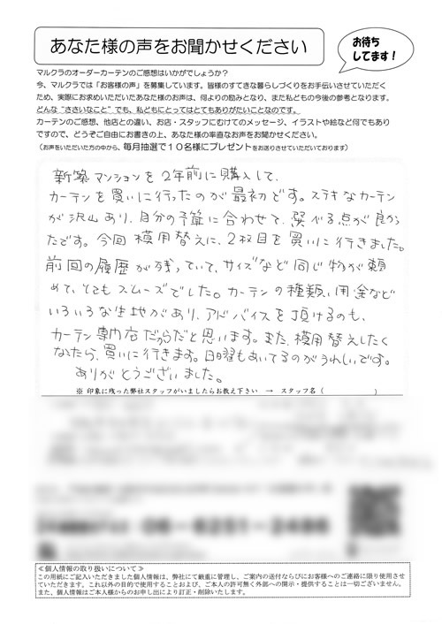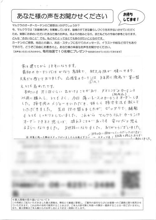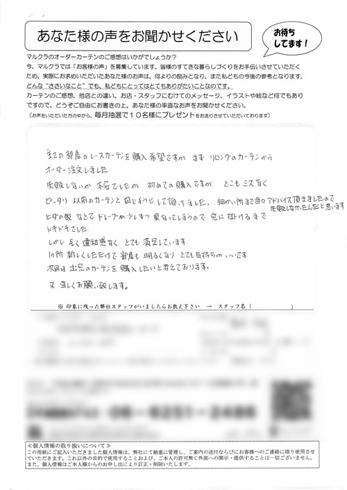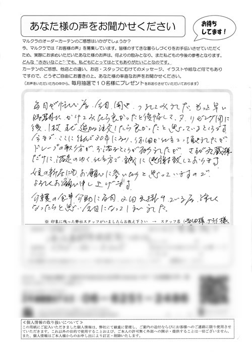 この度は、私の終の住みかとしてマンションにこの8月に転居しました。南向きの目の前に一面緑の小高い公園が立ち、日当り、風通し、静かな環境に恵まれとても気に入ってます。紫外線をカットしまぶしすぎるので光を遮断、熱をのがさず機能を備えたレースと布...