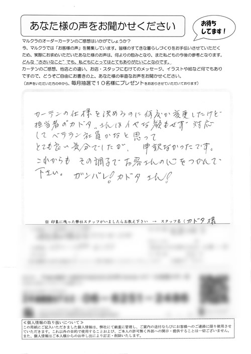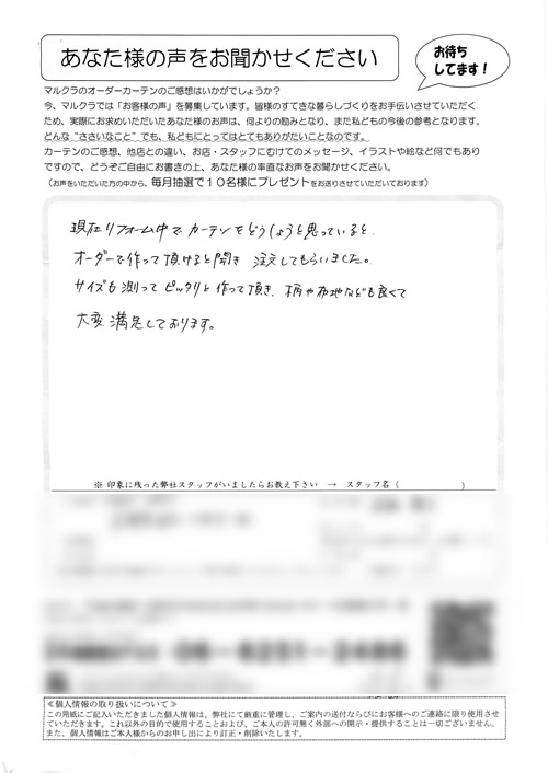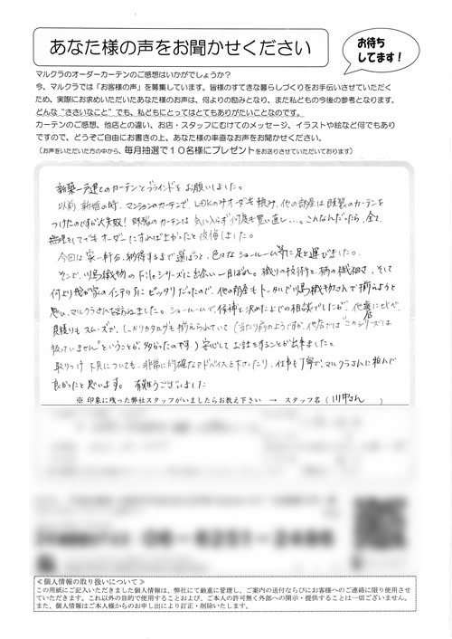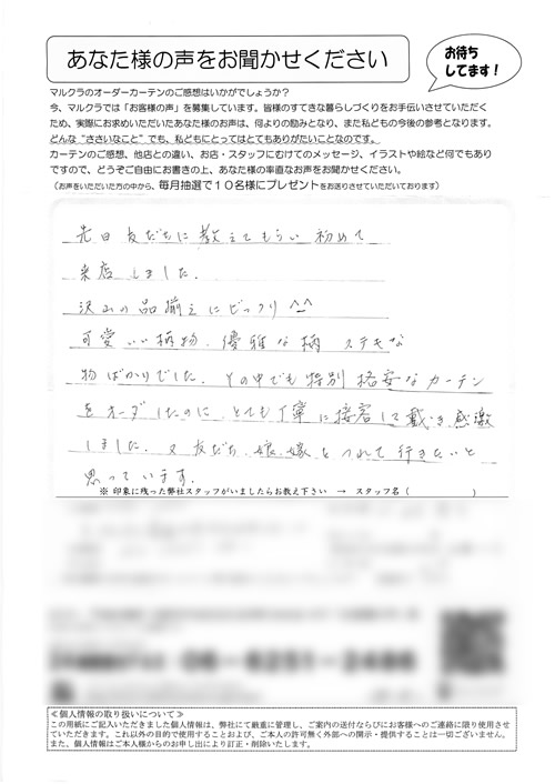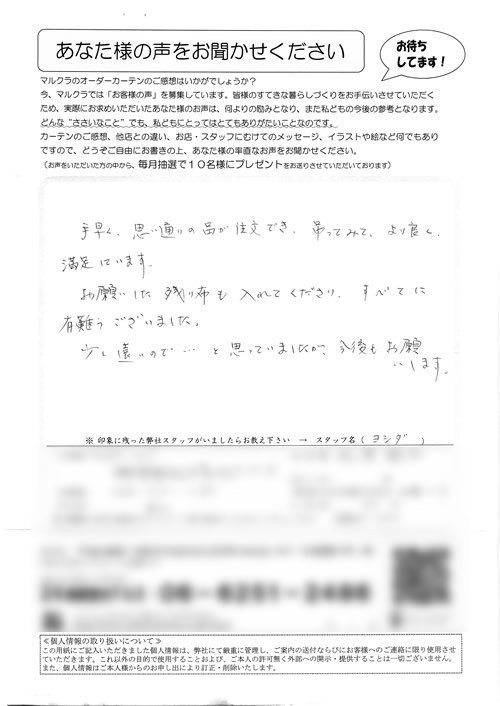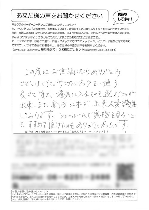 この度はお世話になりありがとうございました。サンプルブックを一通り見せて頂き、一番気に入るものを選ぶことが出来、また割安にオーダー出来大変満足しております。ショールームで実物を見ることをすすめて頂けたのもありがたかったです。