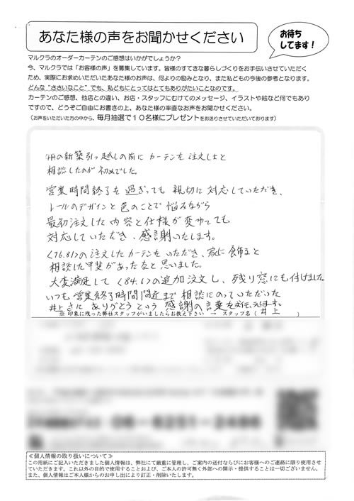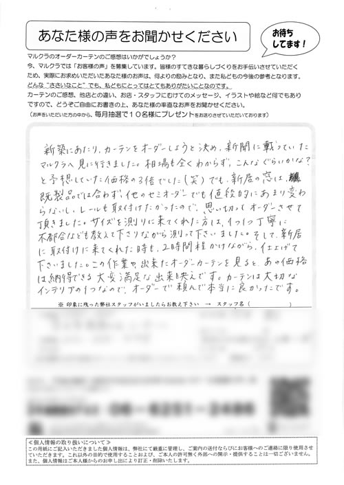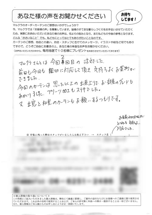 口コミ お客様の声 大阪市西区 R.M様 ここならきっと欲しいカーテンが見つかるだろう!!…