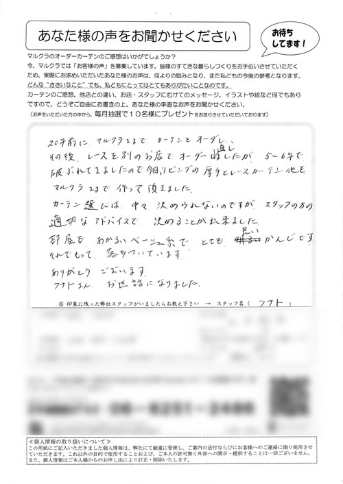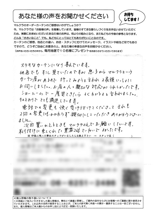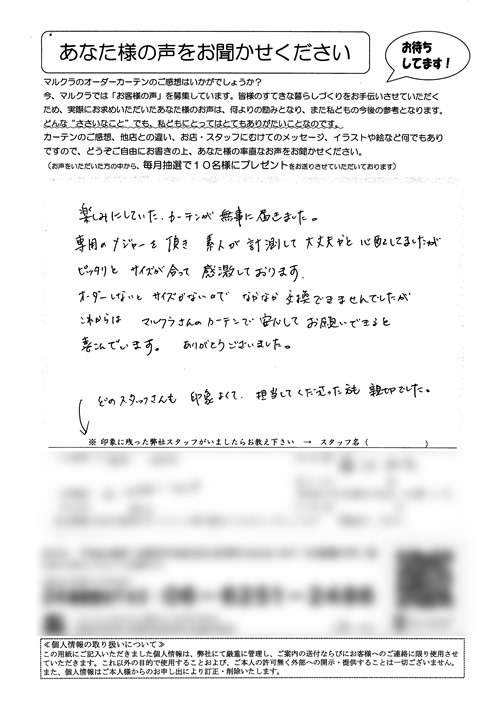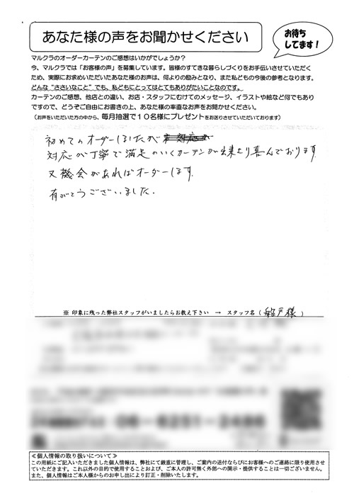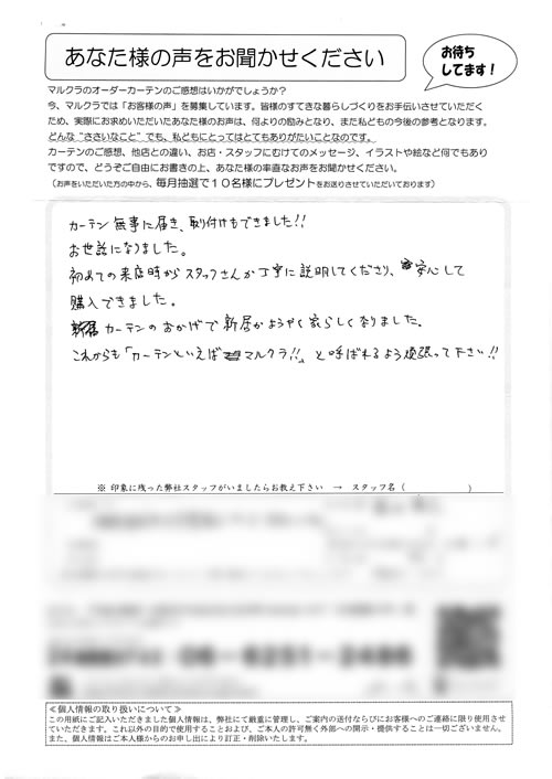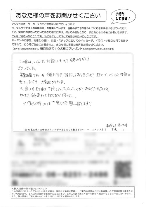 この度は、いろいろと相談にものって頂き、ありがとうございました。某量販店ナドにも何度も行き、検討しておりましたが、貴社でいろいろと相談に乗っていただき、大変助かりました。又、家にも来て頂き、打合せしていただいたのが、ありがたかったです。やは...