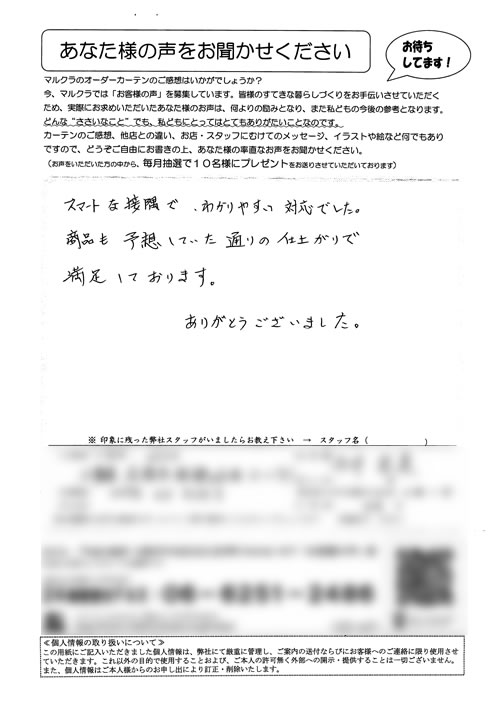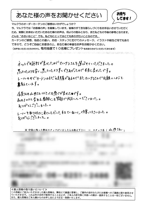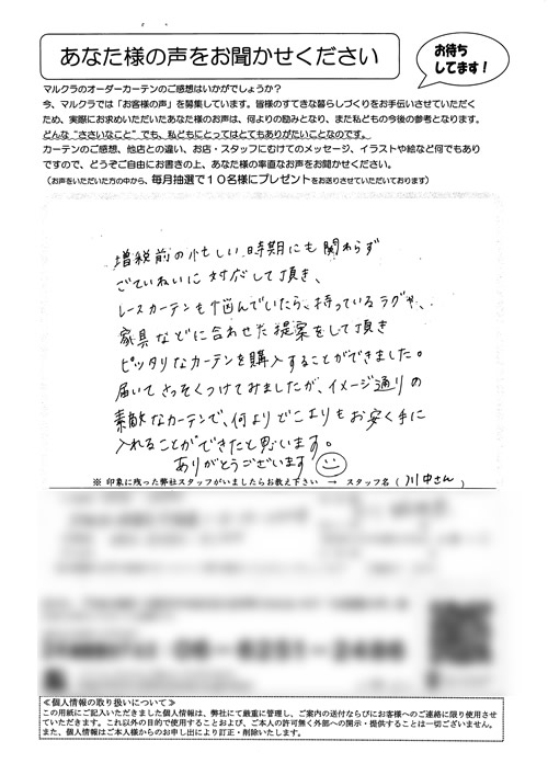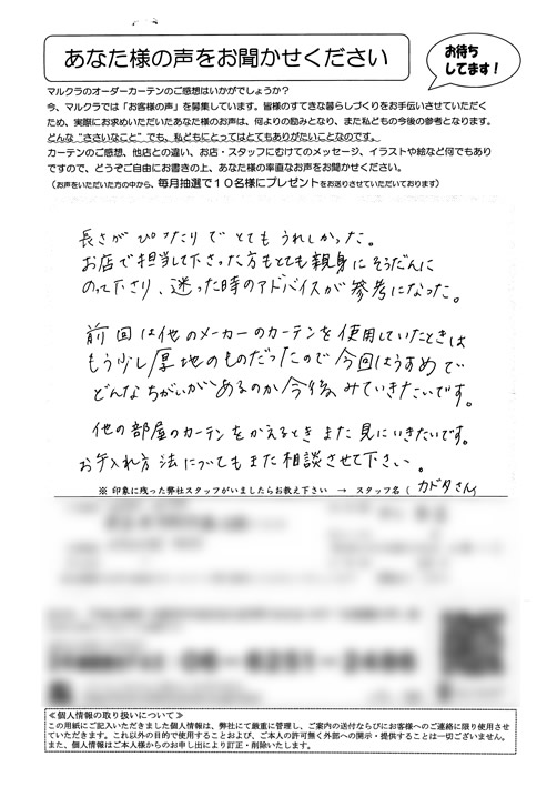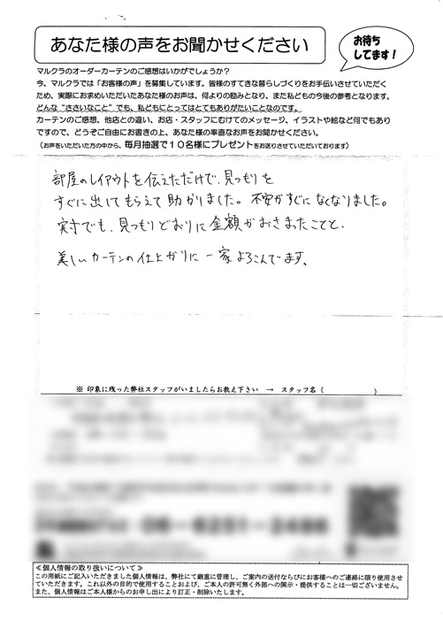 部屋のレイアウトを伝えただけで、見つもりをすぐに出してもらえて助かりました。不安がすぐになくなりました。実寸でも、見つもりどおりに金額がおさまったことと、美しいカーテンの仕上がりに一家よろこんでます。