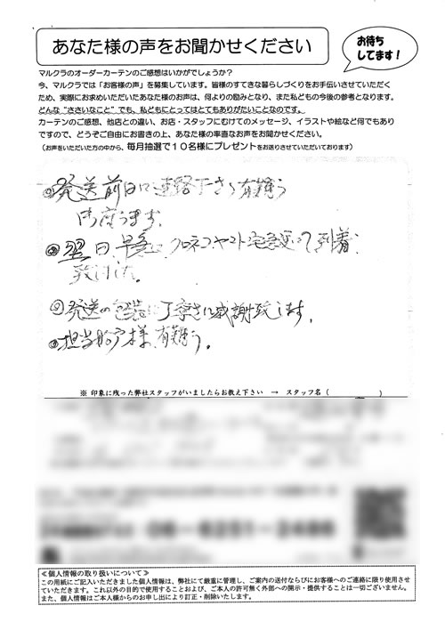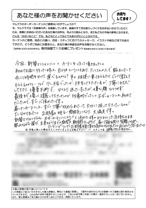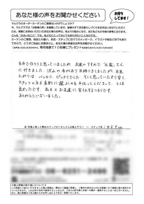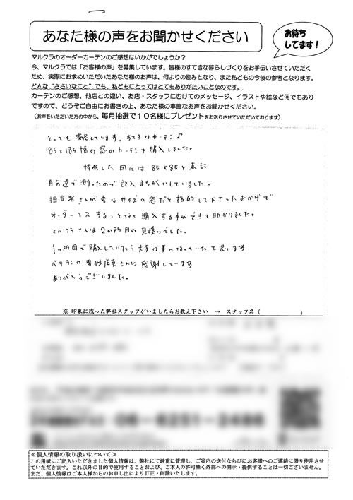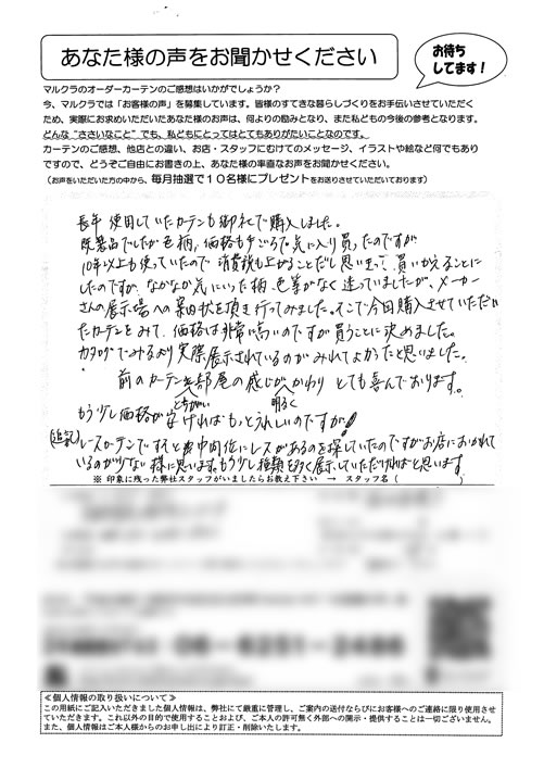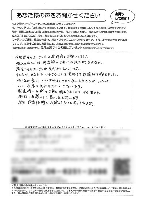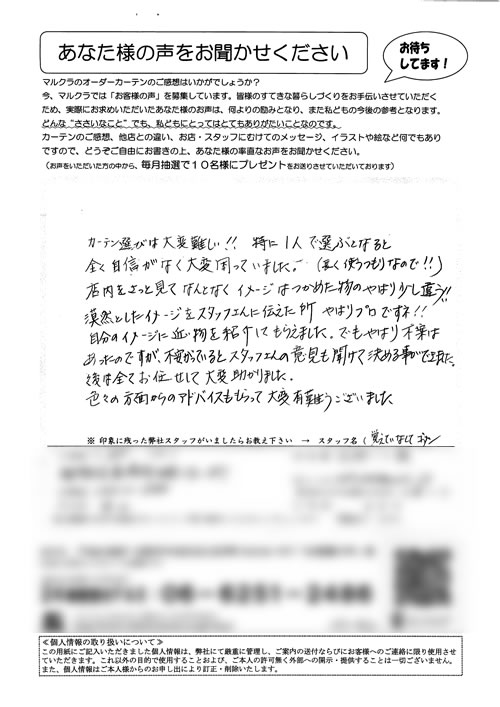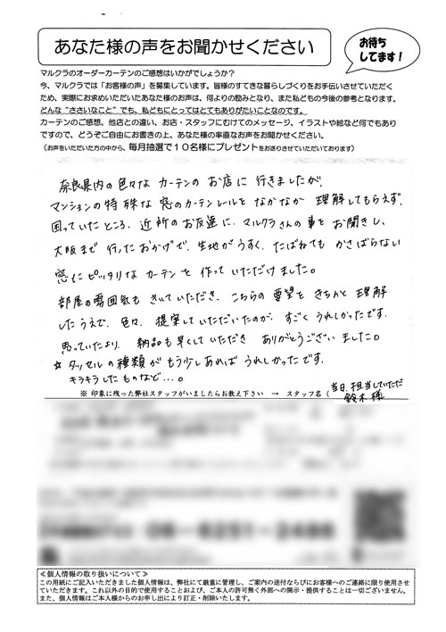 奈良県内の色々なカーテンのお店に行きましたが、マンションの特殊な窓のカーテンレールをなかなか理解してもらえず、困っていたところ、近所のお友達にマルクラさんの事をお聞きし、大阪まで行ったおかげで、生地がうすく、たばねてもかさばらない、窓にピッ...