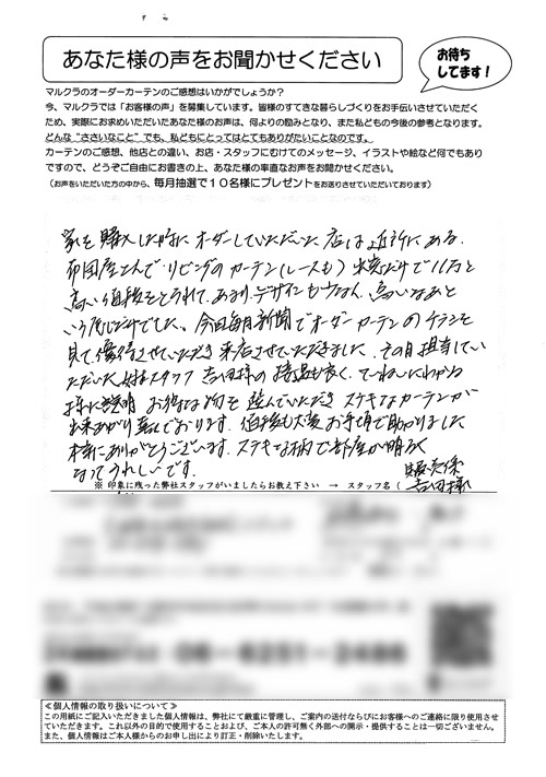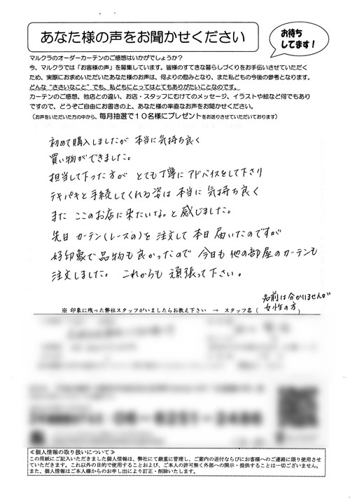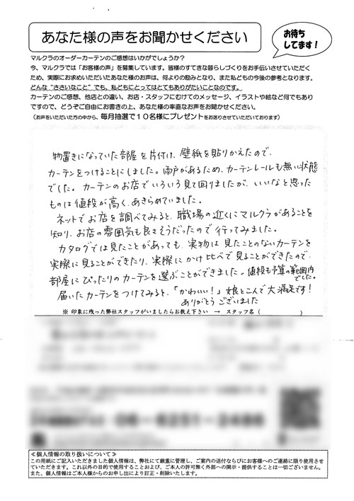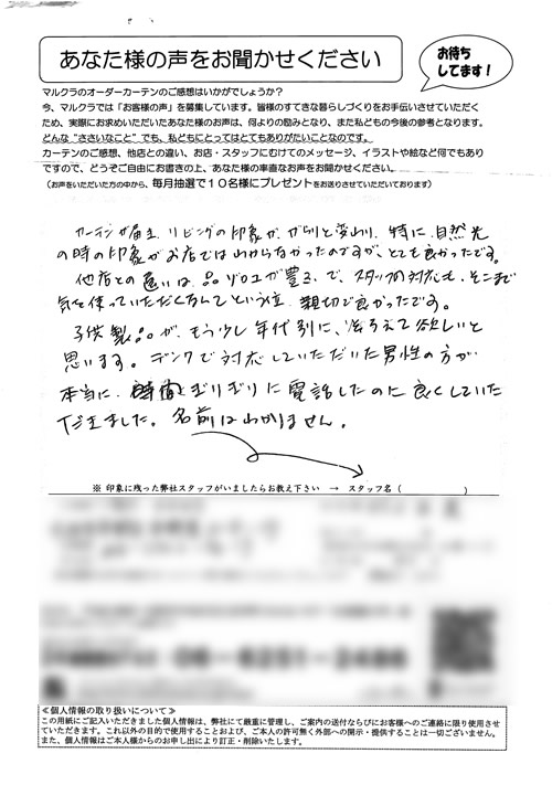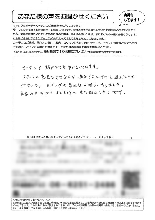 カーテンの柄がとても気に入っています。スタッフの意見もききながら、満足するカーテンを選ぶことができました。リビングの雰囲気が明るくなりました。実家のカーテンをかえる時に、また利用したいです。