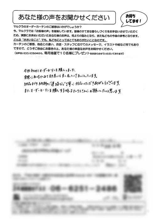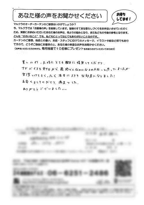 買いに行った時にとても親切に接客してくださり、アドバイスを受けながら最終どんなのになるのかなーと思っていましたが、実際つけてもらったら本当にステキな部屋になりました!お安くもしてくださり、満足でした。ありがとうございました。