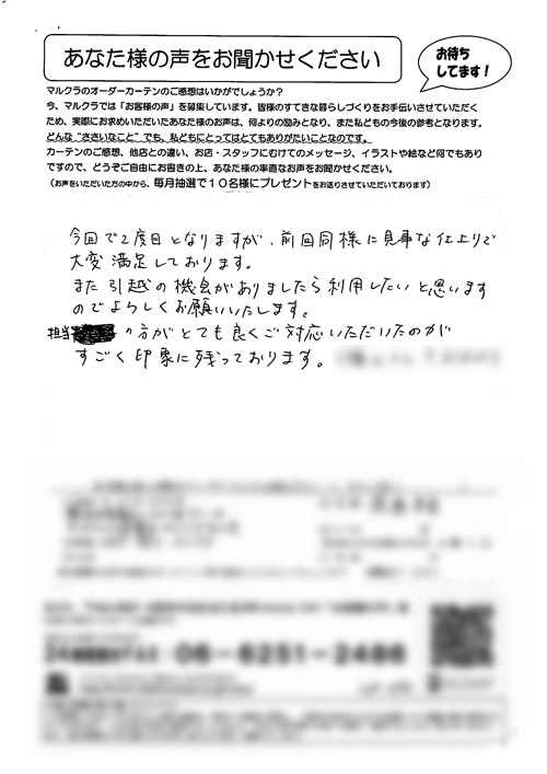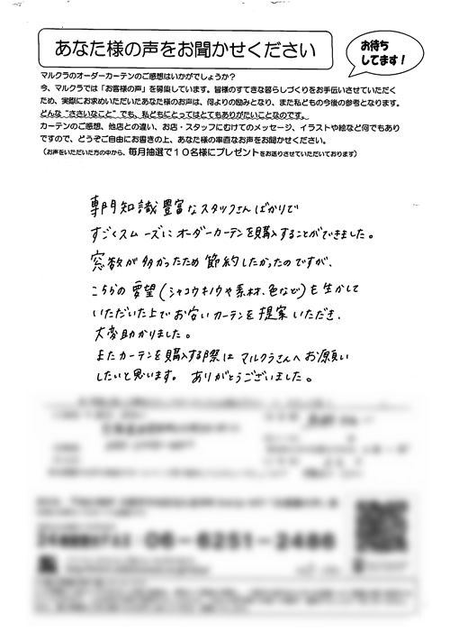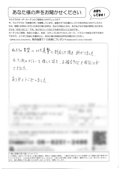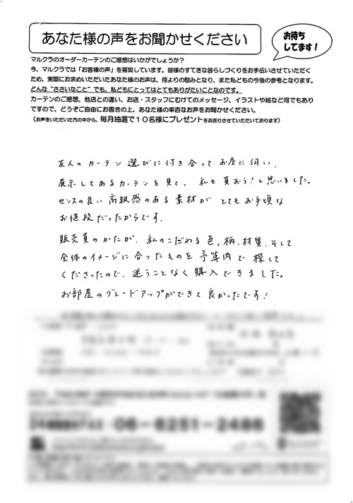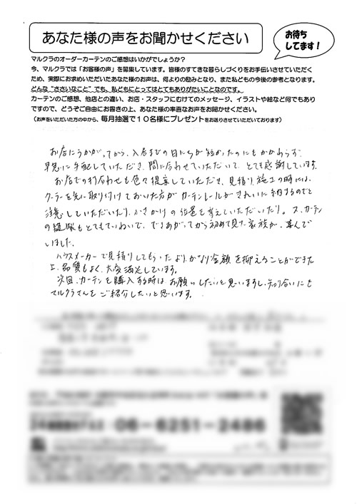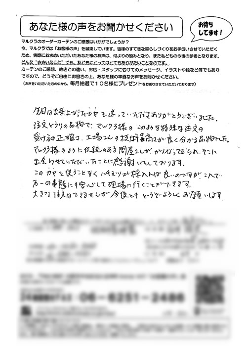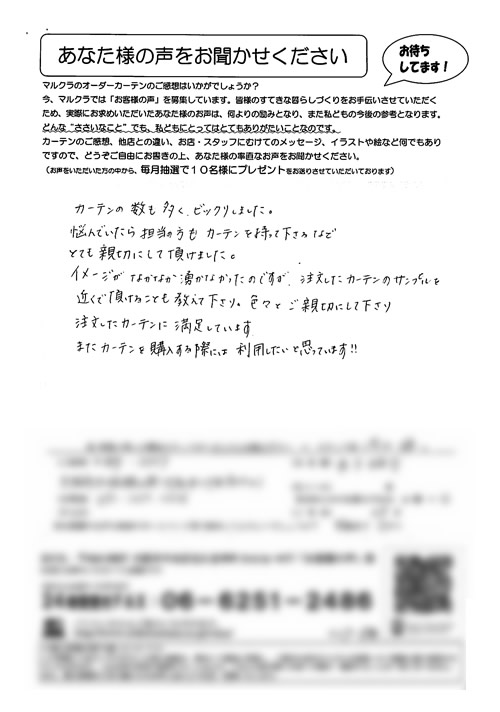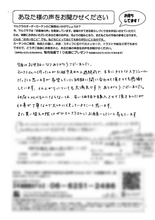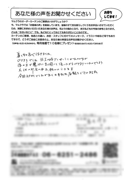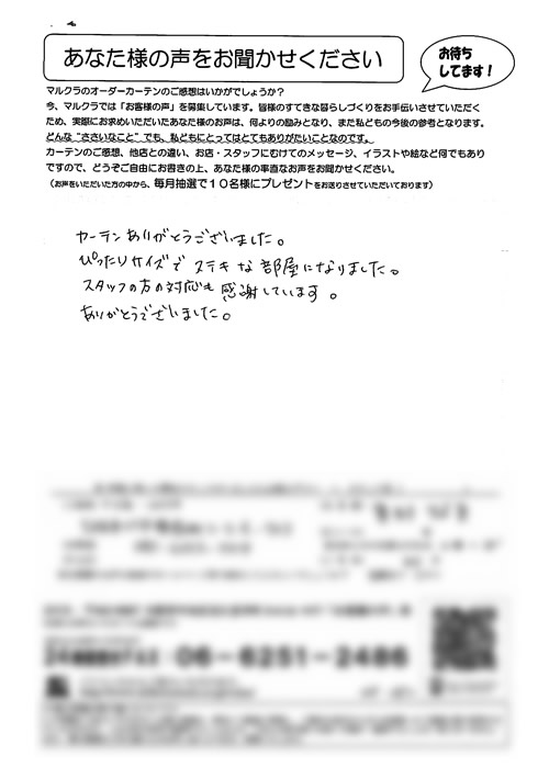 口コミ お客様の声 大阪市北区 M.T様 カーテンありがとうございました。ぴったりサイズ…